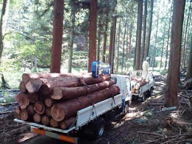 今日は、間伐で出た材木を売りにトラックに積んで木場へ行きました。