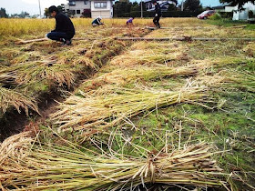 ついにぐるぐる庵でも稲刈りが始まりました。初めての田んぼの初めての稲刈り。周りの田んぼはとっくに稲刈りは終わってさっぱりしていますが、こちらはぎりぎりまでねばっての稲刈りです。