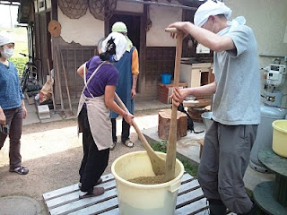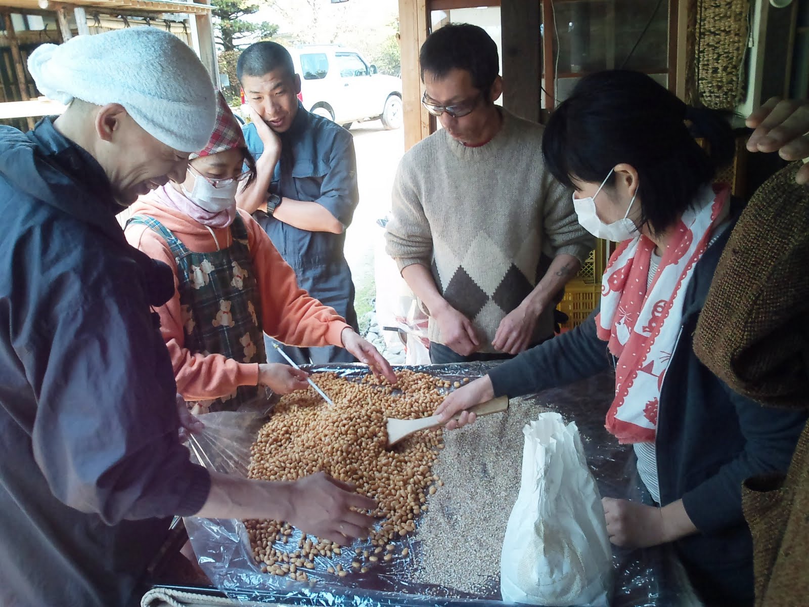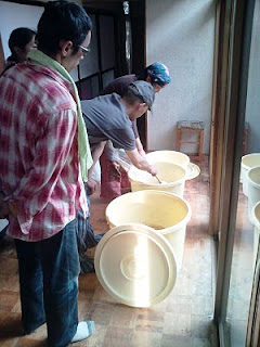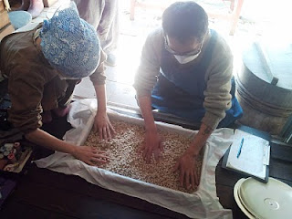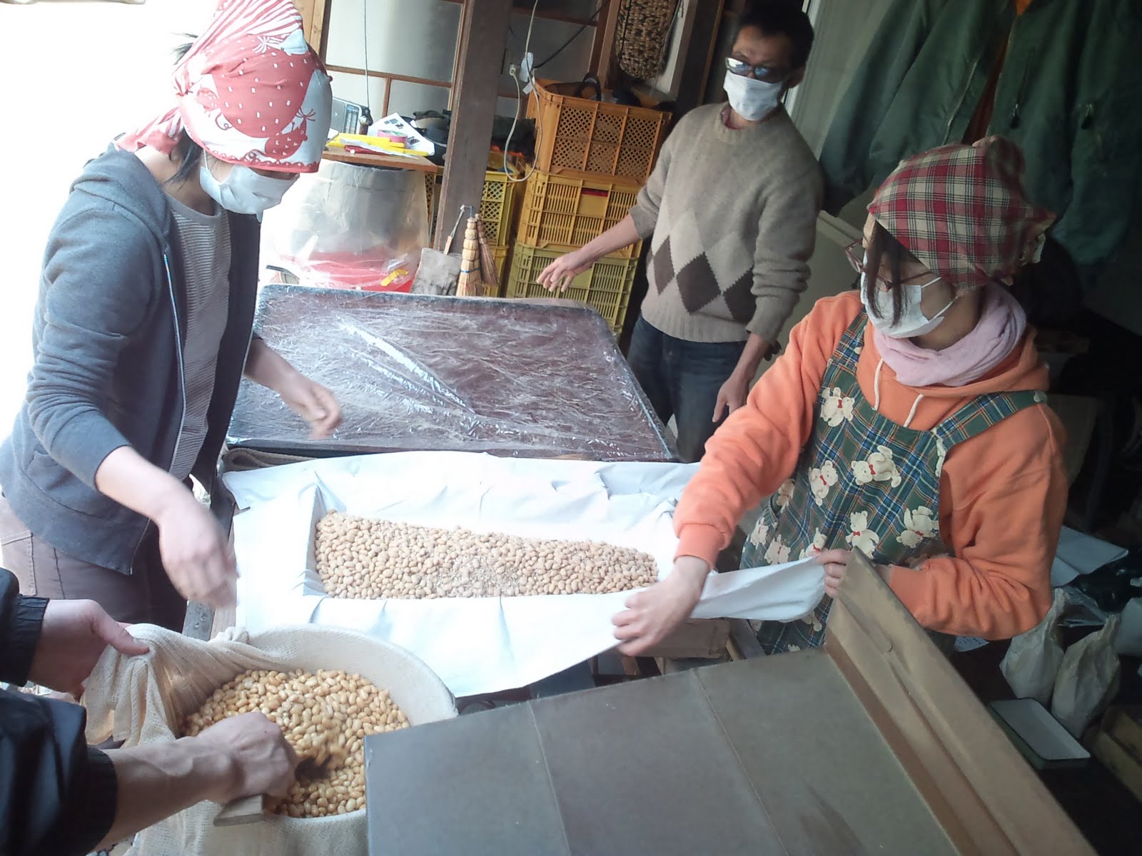 お醤油麹造りの二日目(大豆の蒸煮、混ぜ込み、盛り込み、引き込み)。