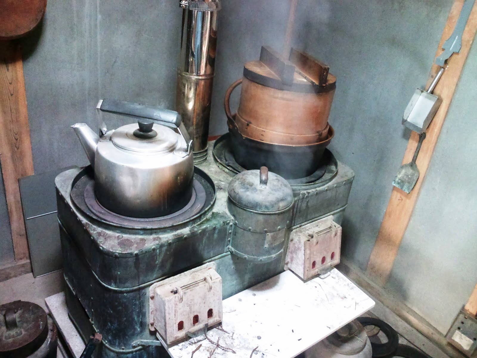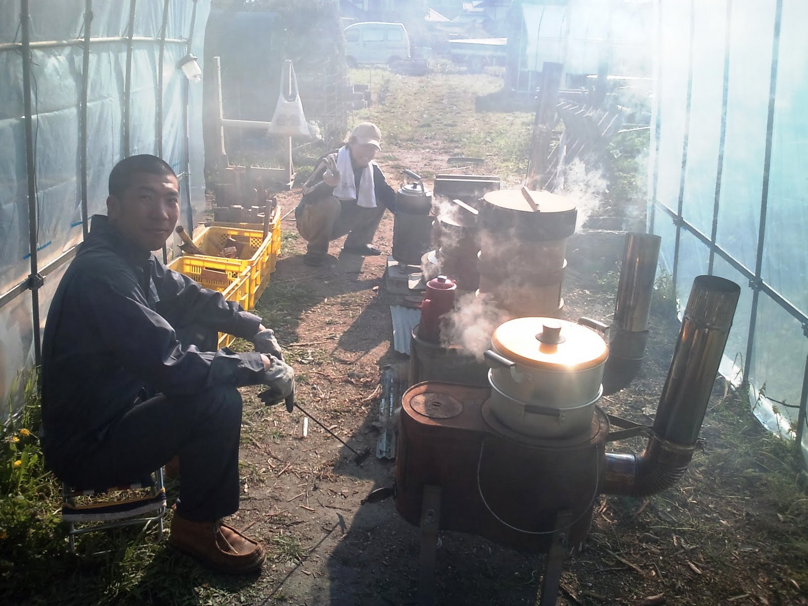 薪ストーブ、竈、総動員で大豆の蒸かし。たいたいさん、こいけさんが火の番と空炊きにならない様に水の補充を責任もってやってくれました。