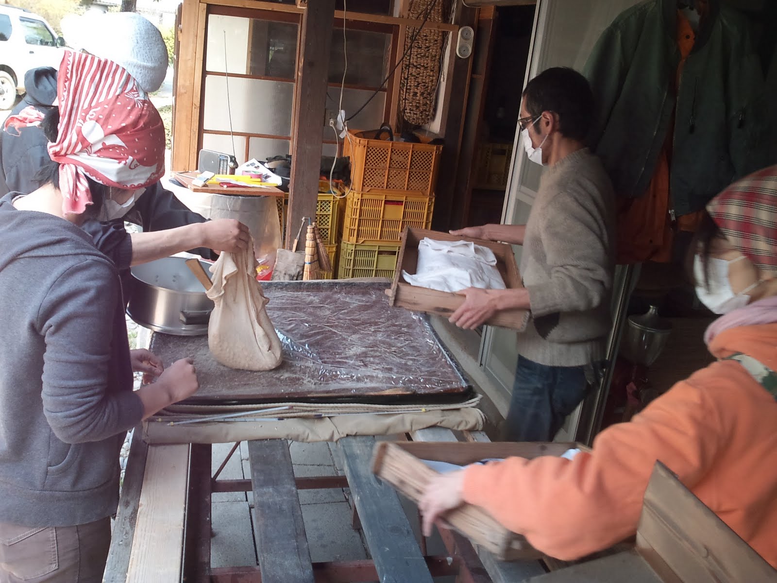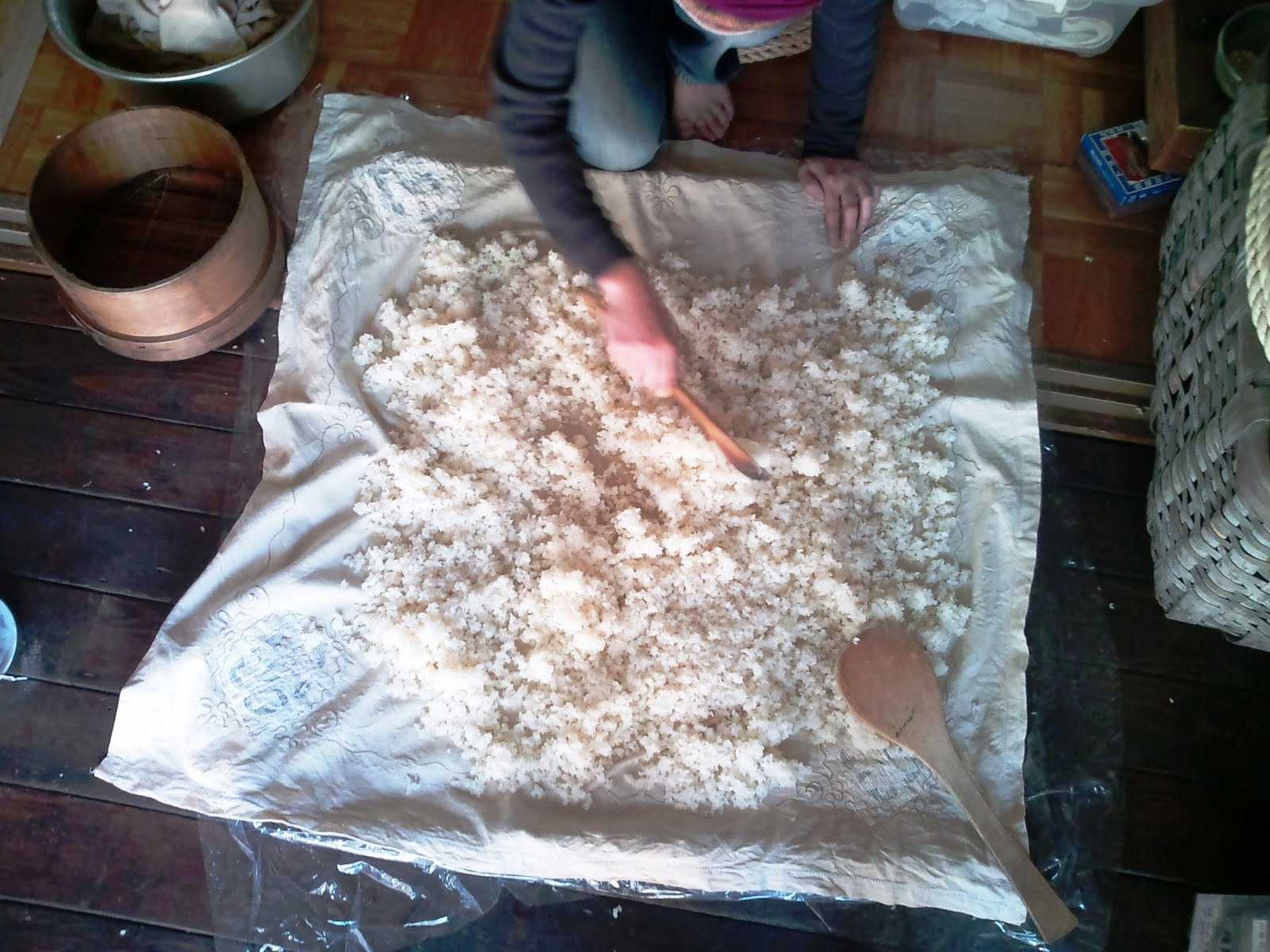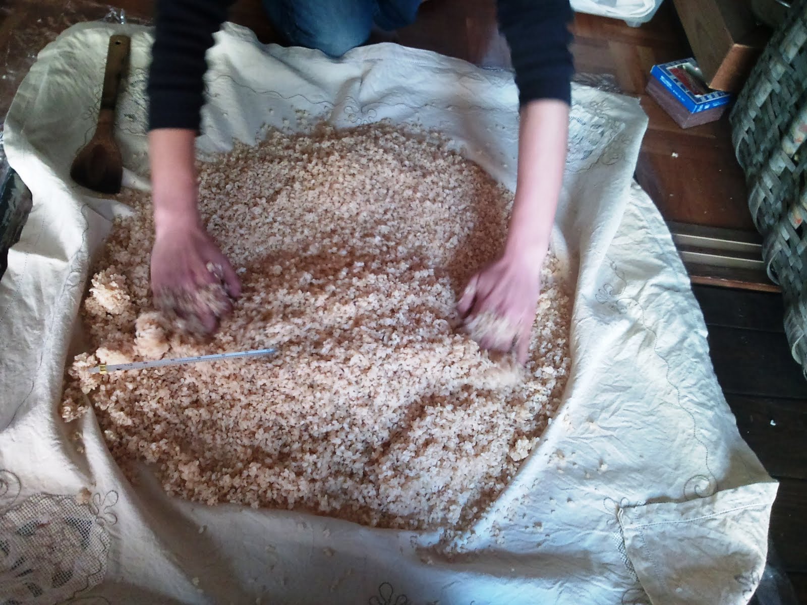 混ぜたら、布を敷いた室蓋に盛り込んでいきます。室蓋に盛り込んだら、布をかぶせて、麹室に入れて培養します(引き込み)。