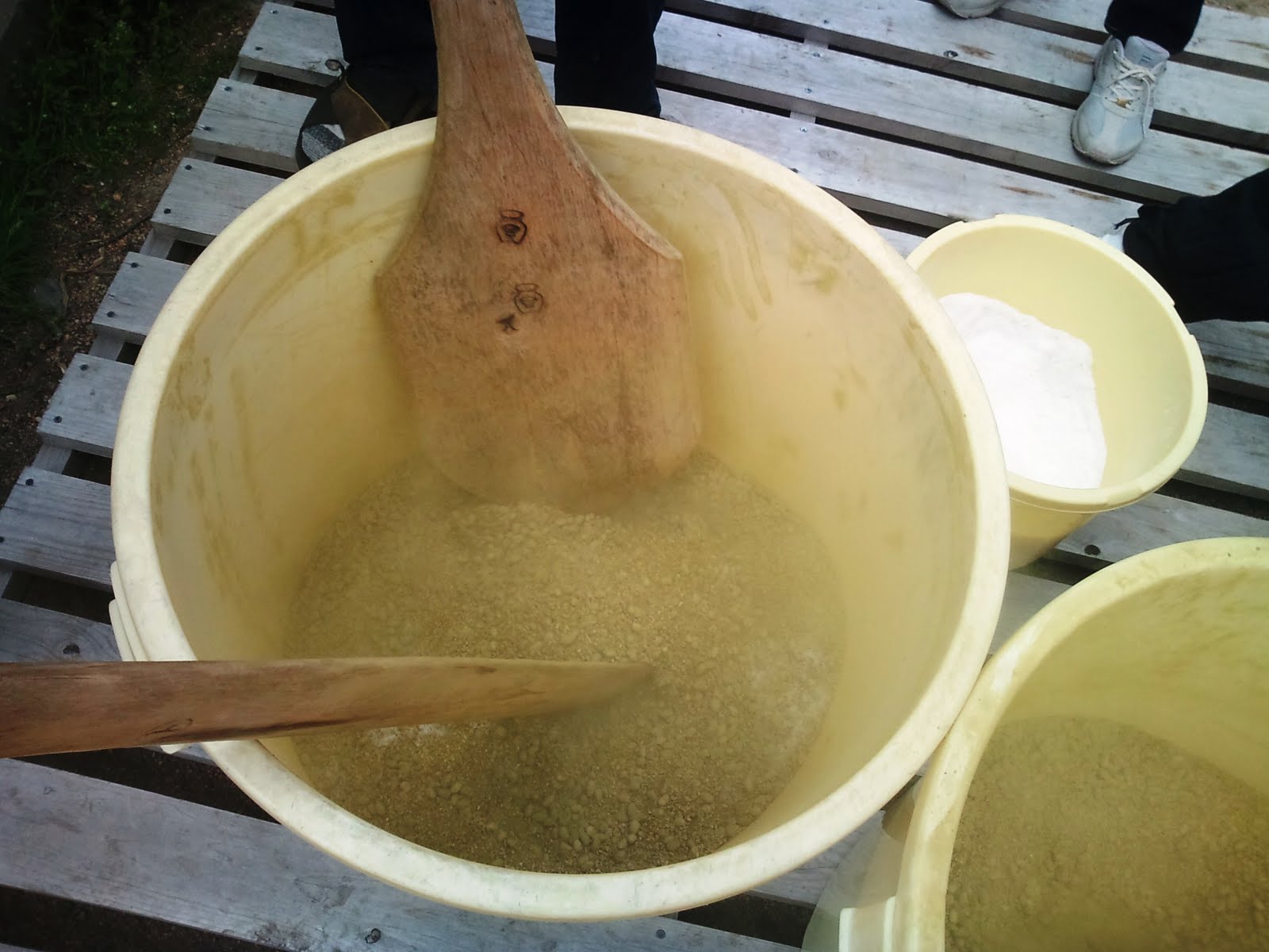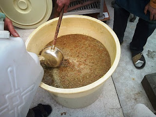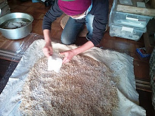 分けた種もやしを、やはり室蓋の数に分けておいた小麦(煎って挽き割った)に混ぜます。
