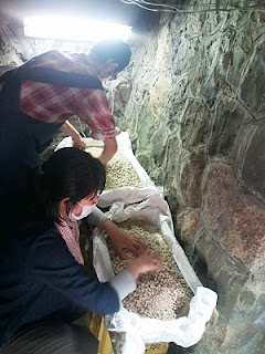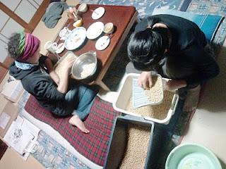 昨日、浸漬しておいた大豆をざるにあけて水切りをします。大豆はぐるぐる産。大切に育てて、一粒一粒選別した大切な大豆です。こぼさないように気をつけて、こぼれちゃったら洗って戻します。