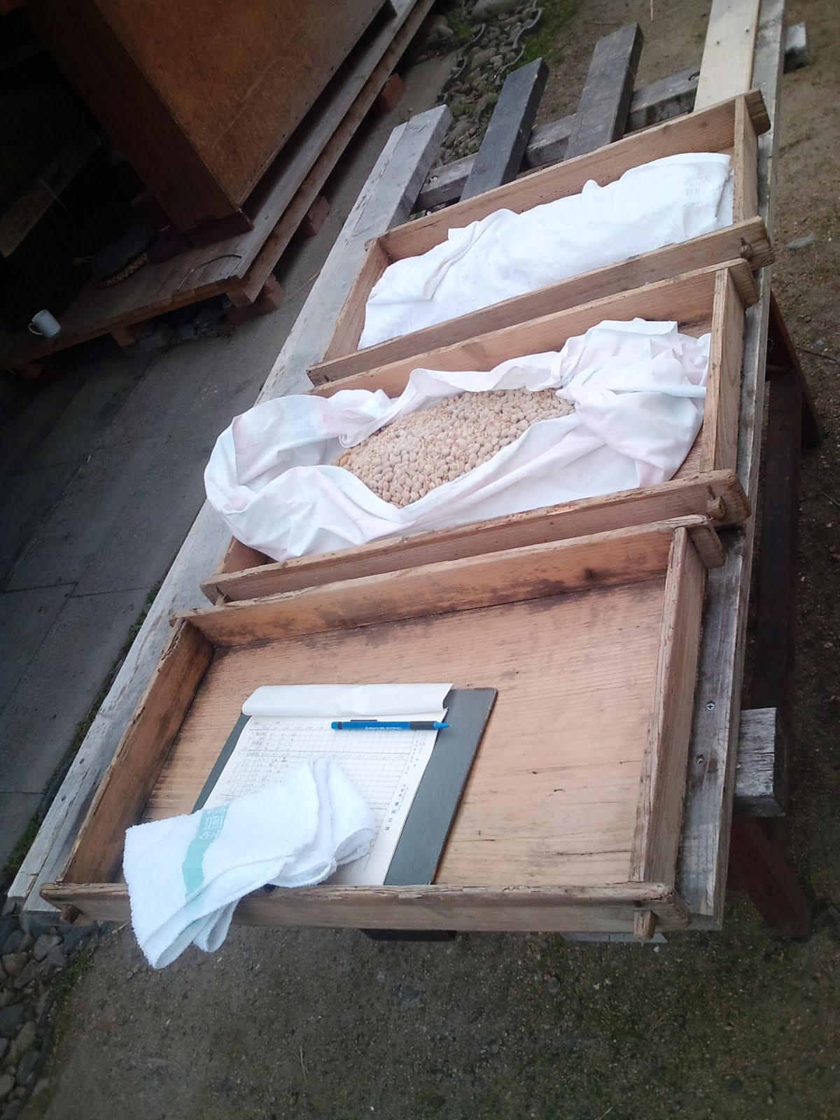大豆を蒸かしている間に、種もやしを室蓋の数に均等分けします。
