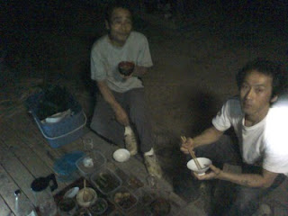 夕ご飯は、やっぱり縁側で涼みながら。今日は女衆が留守なので男衆だけで持ち寄ったおかずとほかほかご飯をいただきました。