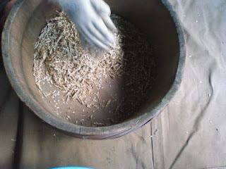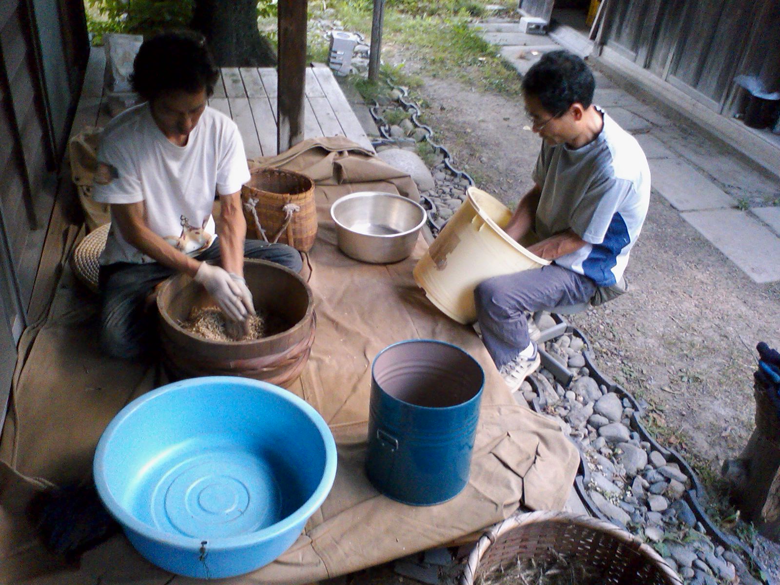 伸さんと伸さんの建築仲間のヤマモトさんが来て小麦の籾すりをしました。