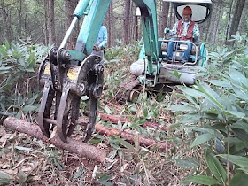 グラッパーのついたバックホーで大きな丸太も自由自在に動かせる。