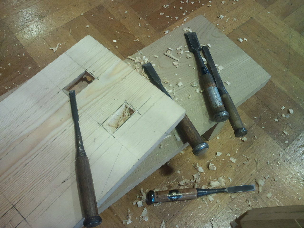 斜めに伸びる足に、貫のほぞがうまく入るようにしないといけませんが、「足がそのままだと複雑になってしまうので、真四角の足を接地面の方が真四角になるように菱形に削って(曲とり)、それから貫のほぞ穴の墨付けをします。」ということで、さっぱり??なのですが、もう最近規矩術ノイローゼになりそうなので、ここはさらりと流して、言われたままに作業しました。