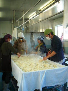 ●タイムスケジュール8日、9時前に味来センター集合。9時からセンターで麹の管理と、大豆を蒸して、潰します。終了16時。9日、8時前に味来センター集合。8時から出麹"でこうじ"(麹ができて、麹室"こうじむろ"から出すこと)、機械で大豆と麹と塩の混合。樽に仕込む。終了10時30分
