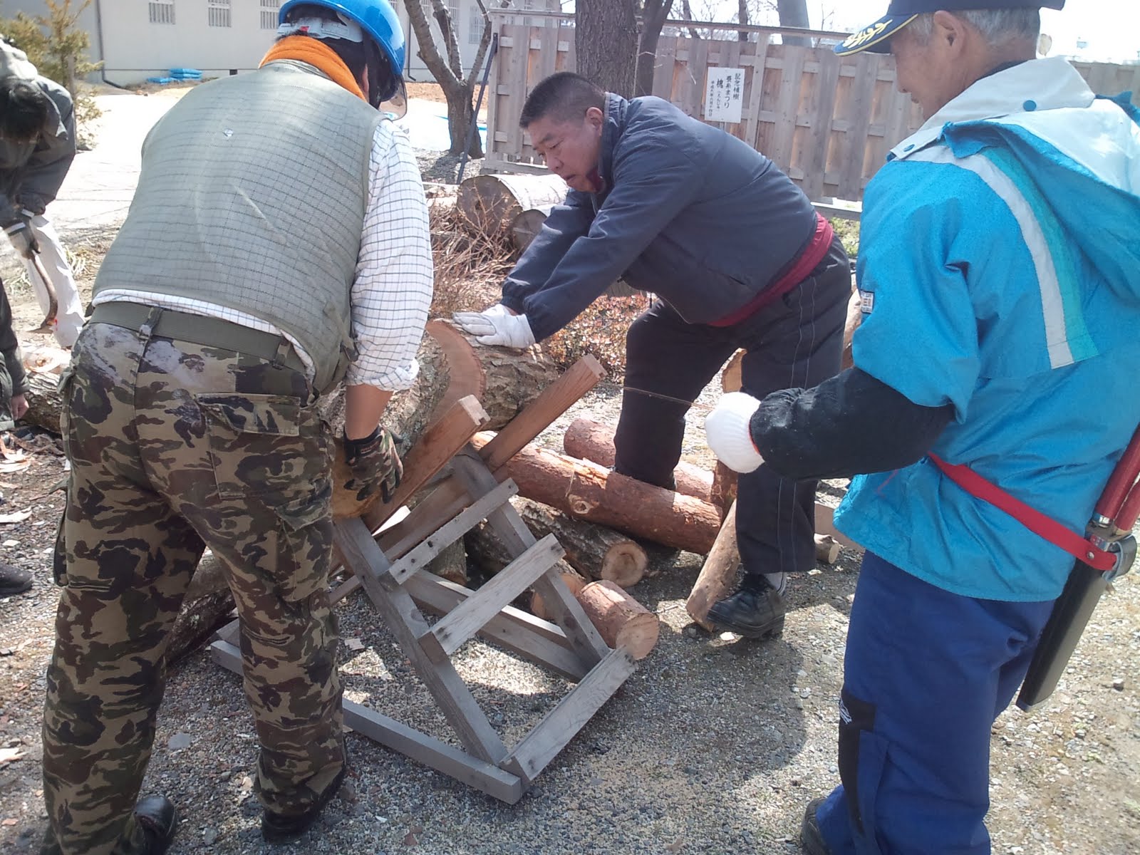 丸太を横に切るには、ガンドウという長い柄の鋸を使う。チェーンソーが出る前は、この鋸一本で、製炭の原木を伐倒したり玉切りしたりしたという。