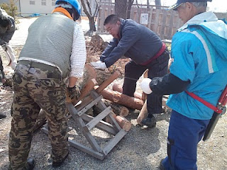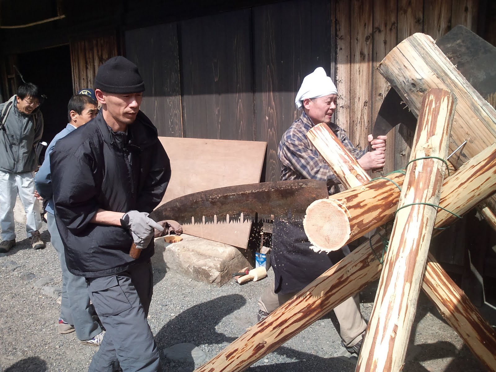丸太を角材にする‥まず、墨が付くように木の表皮をマサカリで剥ぐ。
