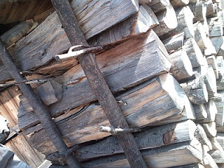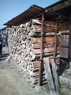薪を積んでおいてあるのだが、なぜこんな細い柱で、あれだけの薪を支えることができるかというと、柱に枝が二股になっている枝を引っ掛けて、枝の先を薪の自重で押さえて、柱を引っ張っているからなのです。