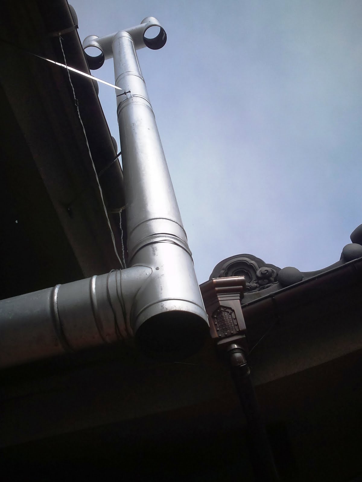 L字に曲がった煙突筒の下が外れるので、外して、そこにバケツを取り付け、横の筒、縦の筒に、ブラシを通して掃除します。