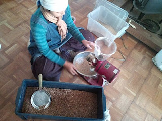 煎った麦を、ひと粒が5~6個に割れるように、コーヒーミルで挽き割ります。