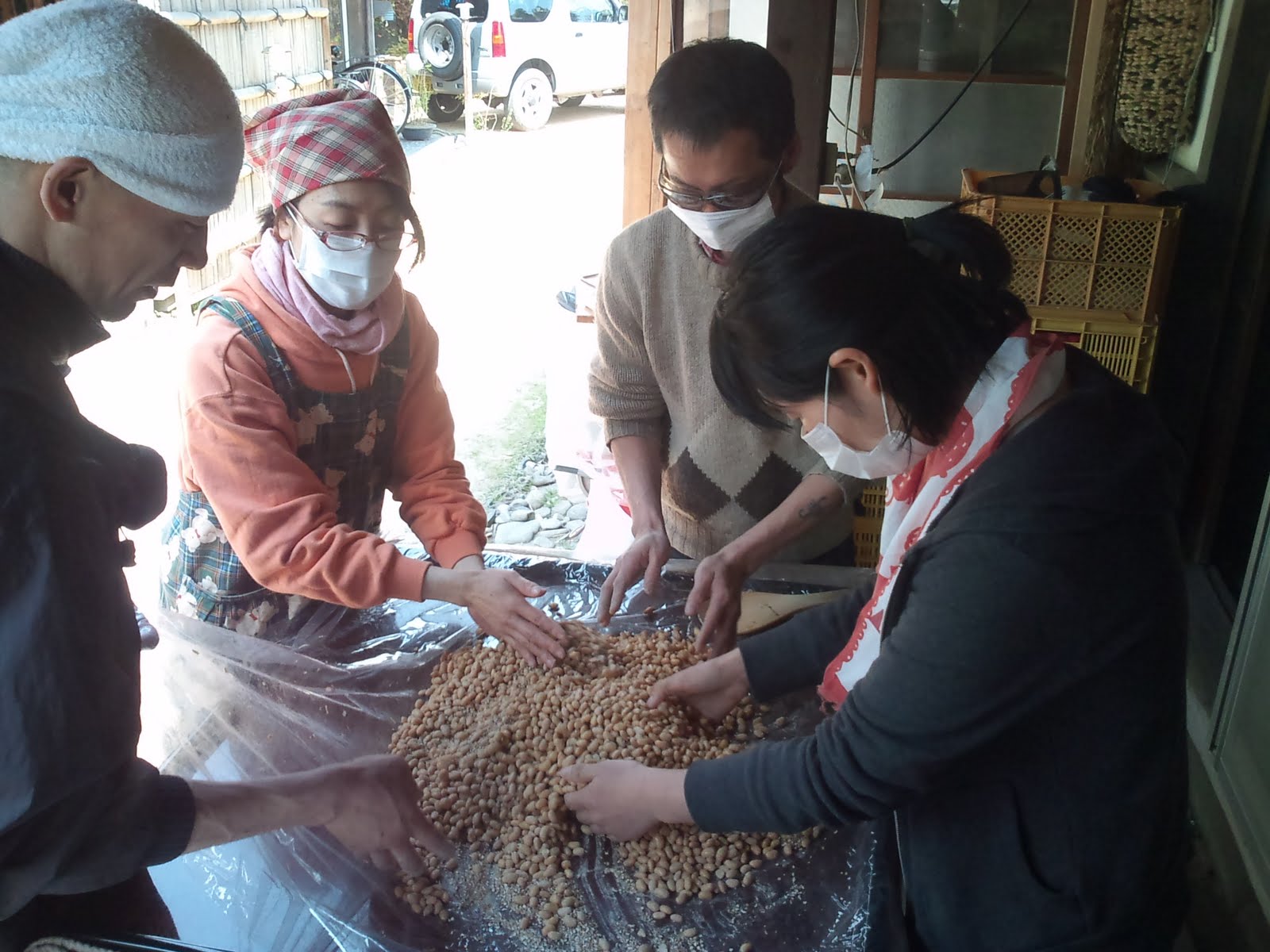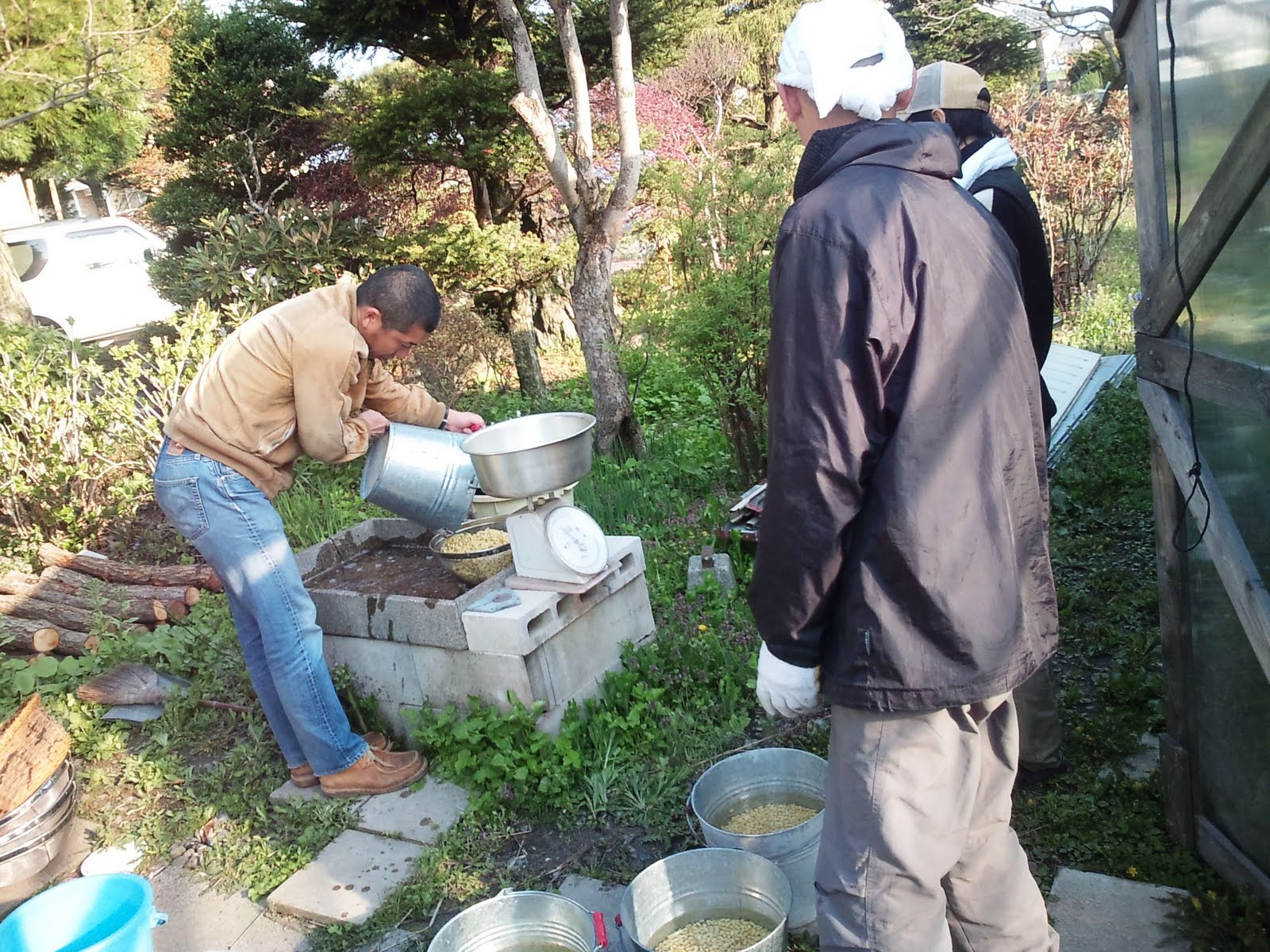薪ストーブ、竈、総動員で大豆の蒸かし。たいたいさん、こいけさんが火の番と空炊きにならない様に水の補充を責任もってやってくれました。