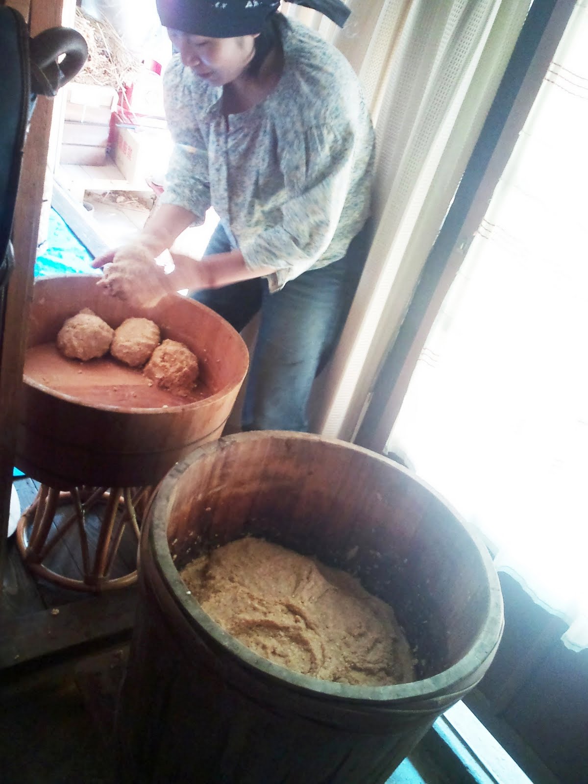 バケツに、ゆでてつぶした大豆、塩、先週造った米麹、種水を量って入れて、塩分12%、仕込み総量≒100キロの味噌の仕込みです。