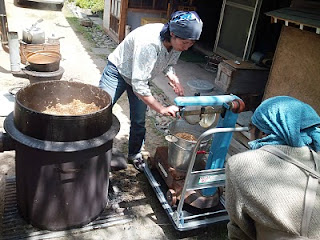 ミンサーでつぶします。いつもはモーターにベルトをかけて回すのですが、今年はモーターの調子が悪かったので手動で、手で回してつぶしました。男手もあったので十分でした。
