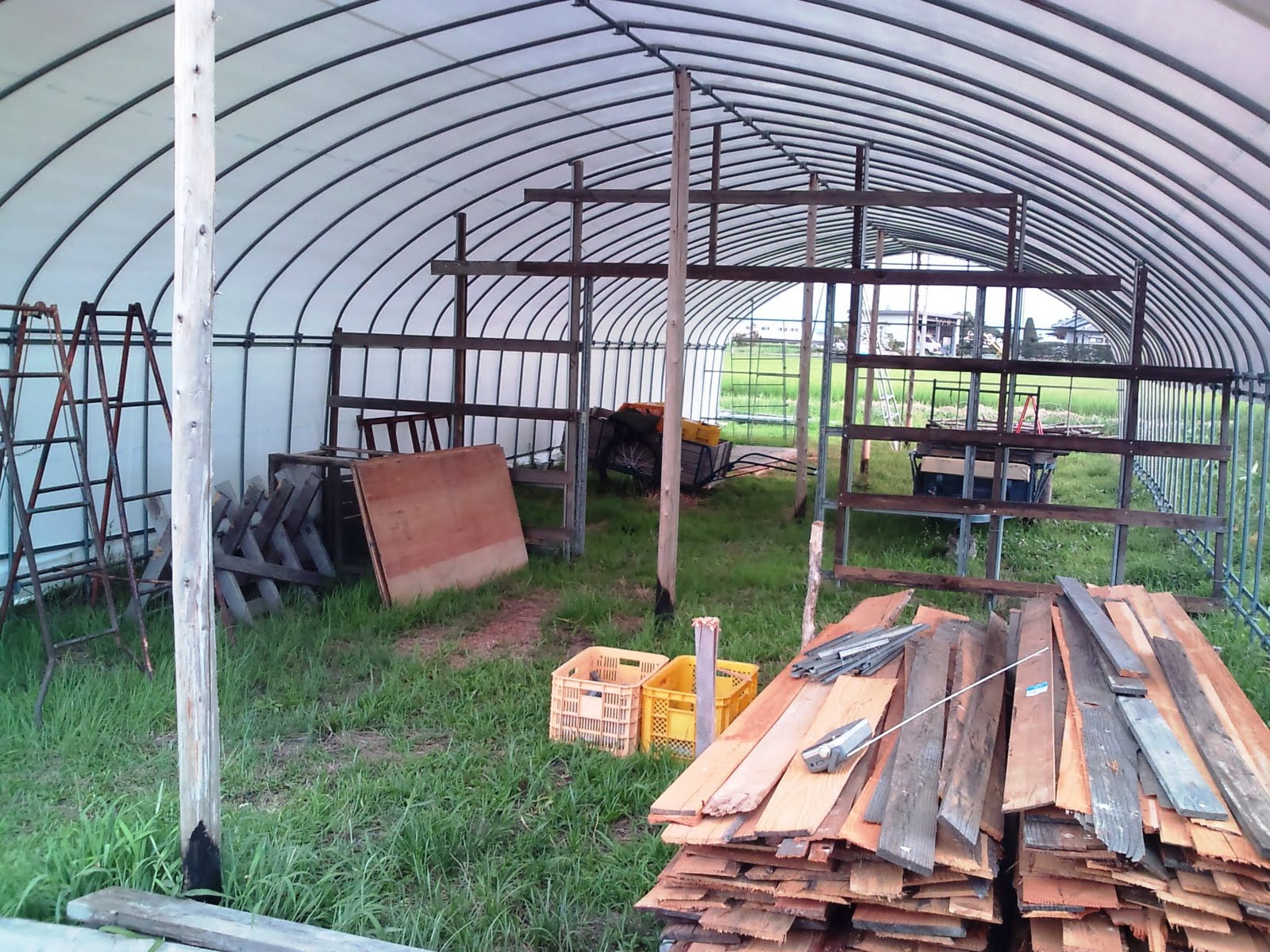 作業場としてビニールハウスを建てていましたが、このほどやっとビニールをかけてちょっとした作業ができるようになりました。