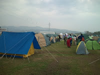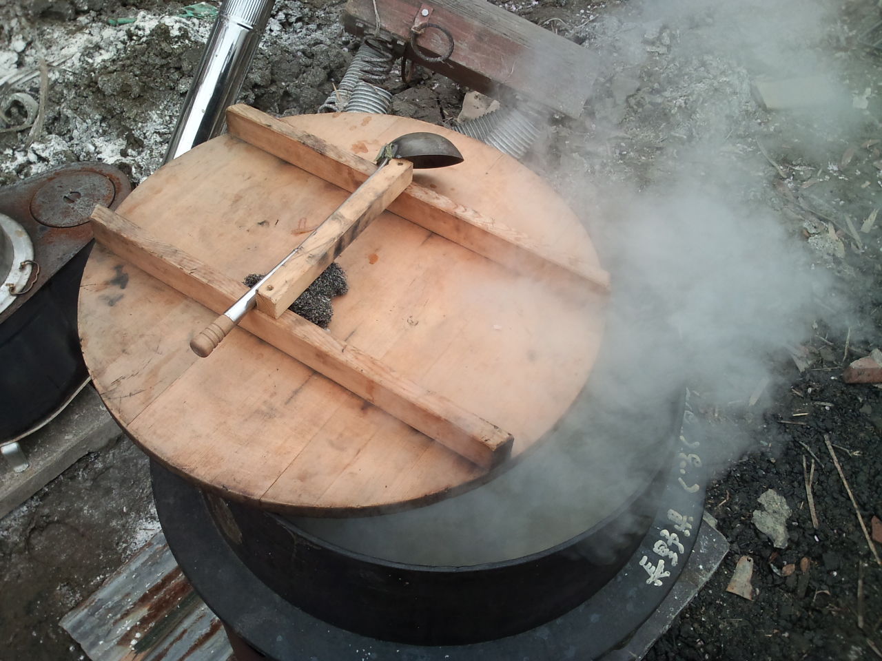 「第1テント」の前に味噌炊き釜、足つき薪ストーブを展示して、使ってもらえる方を募る。